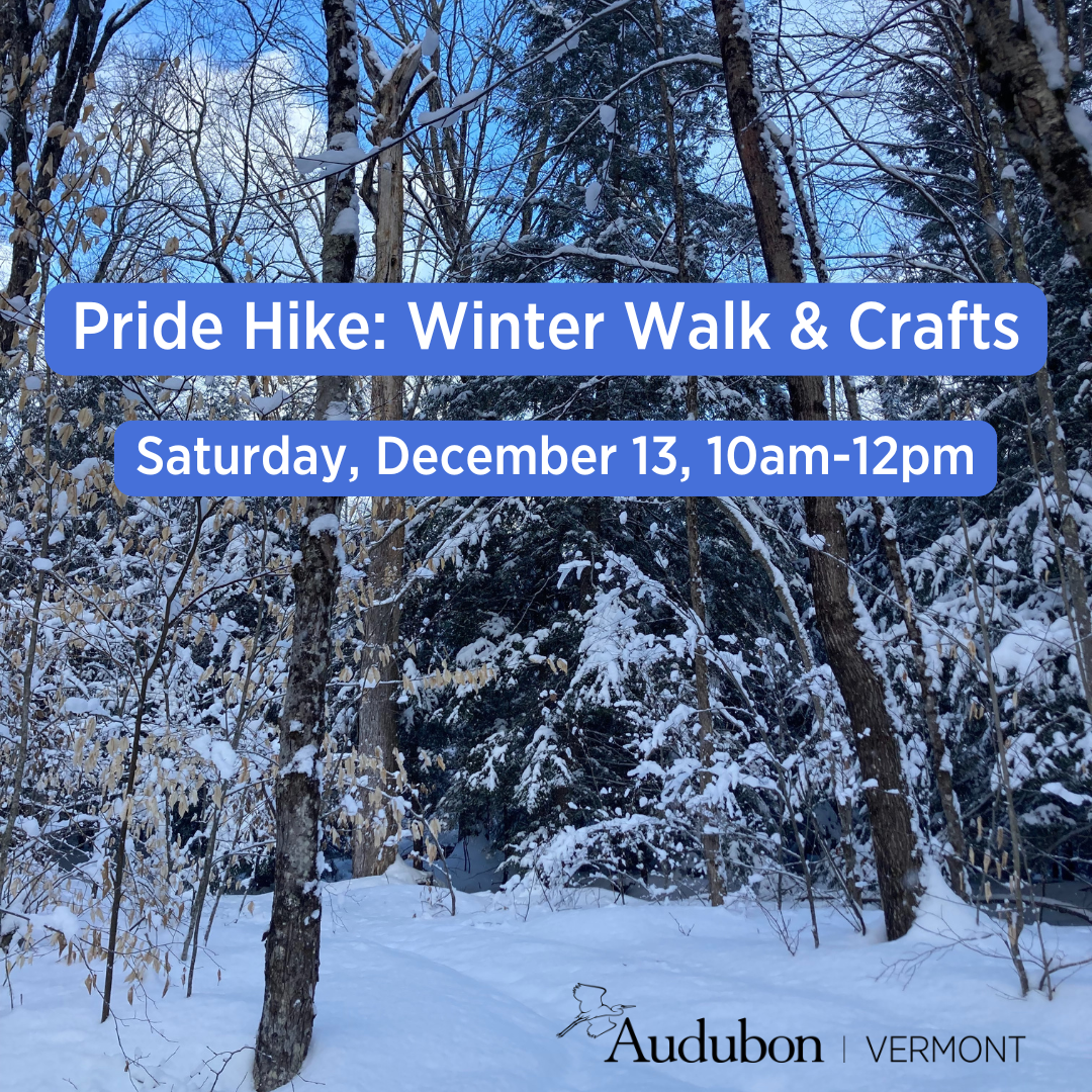 Our December Pride Hike will be at Audubon Vermont's homebase, the Green Mountain Audubon Center in Huntington. Our Center is free and open to the public year-round from dawn until dusk and boasts 250+ acres, 5-miles of trails, and unique natural communities. We will walk our upper trail system, including the Warbler Trail and Hires Trail. We will end our hike at the Education Barn where we will have warm beverages and crafting materials. Before crafting, we will go over how to make a zine, the basics of nature journaling, and share some art examples for inspiration. Craft materials provided include: cardstock, multipurpose art paper, collaging materials, pencils/markers/colored pencils, glue sticks, and watercolors. Please feel free to bring your own craft materials to use yourself or to share with the group!