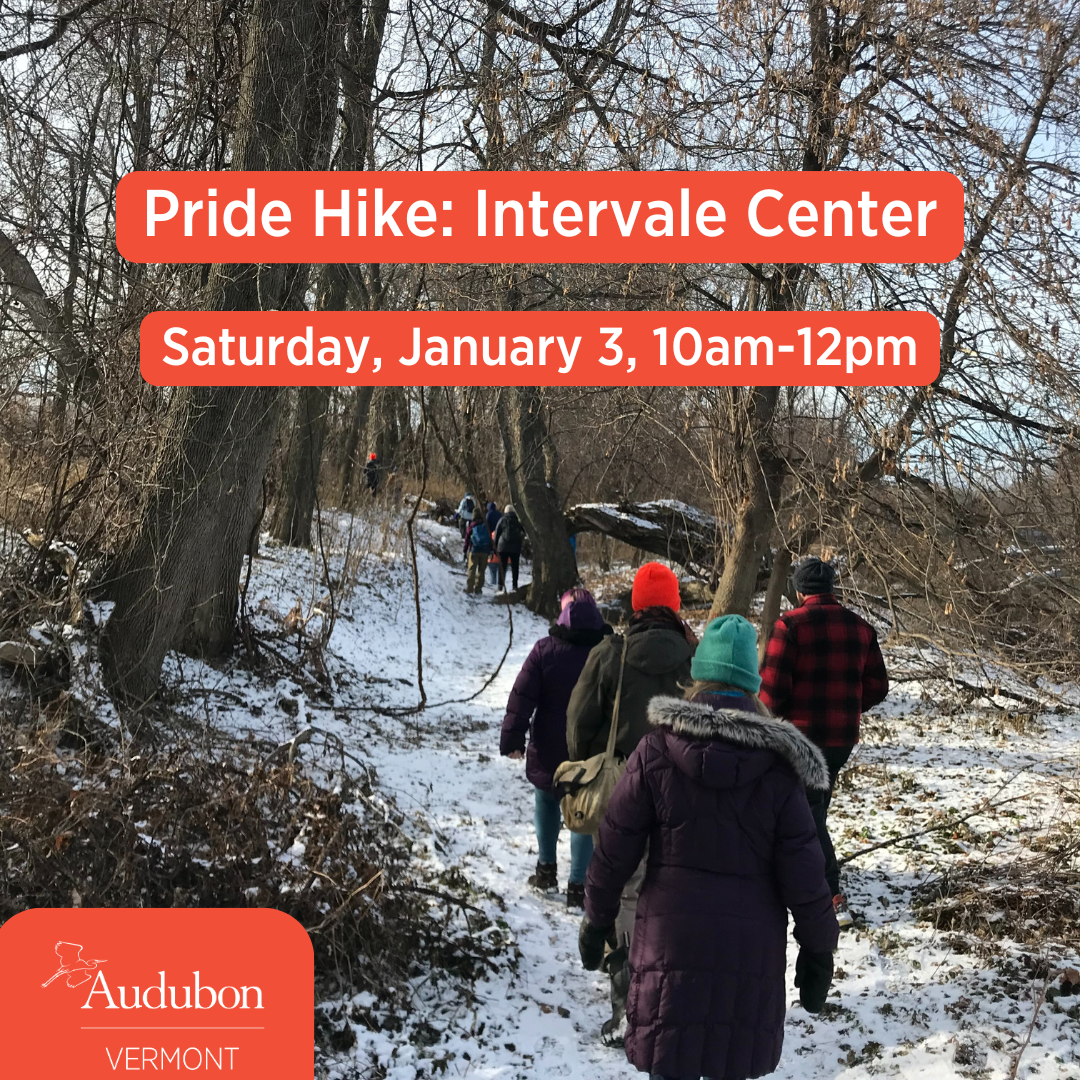 Happy New Year, Pride Hikers! We're jumping into 2026 with a Pride Hike at the Intervale Center in Burlington. Audubon will provide binoculars and wildlife tracking guides in hopes that we see some signs of animals during our walk. Our walk will take us along the Winooski River, through an old grove of maples, and past farm fields. We will meet at Information Kiosk near the office buildings. See Intervale's Trail Map for more info.