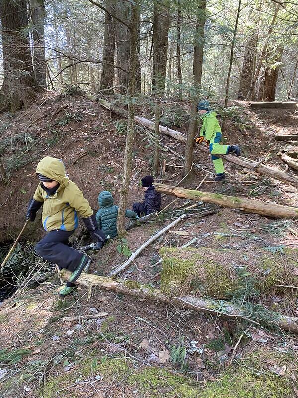 We didn’t get to the brook last week, so we made it our first task this week. At the brook there wasn’t a lot of icy anymore. Some of us worked on making a dam, others explored the ice that was there, breaking it, hearing the sounds, etc. We enjoyed another stick race too.