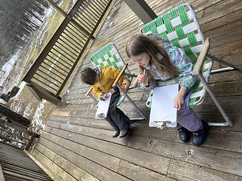 Some new snow from the weekend welcomed us at Audubon today. The temperature was raising the and cold and warm air was mixing creating some great fog. I started to pour upon arrival, so our morning activity was moved inside. To build off of last week's activity we used the OuiSi cards but instead of sorting them our task was to draw the continuation of the image. So if it was a zoomed in picture of a fish eye, then we would draw the rest of the fish body and where we think it was located. It was so great to see everyone use their imagination and see how we all think a little differently.